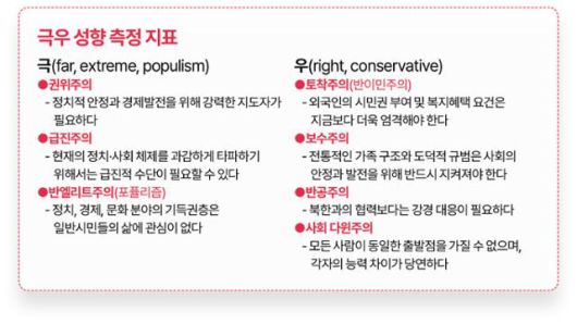 그래서 이번 연구에선 '극'으로는 권위주의, 급진주의, 반엘리트주의(포퓰리즘) 등 3가지 요소를 제시했다. '우'로는 토착주의(반이민주의), 보수주의, 반공주의, 사회다윈주의 등 4가지 요소를 제시했다. 이 7개 요소에 동의하면 극우로 분류했다.