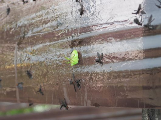 2025년 7월6일 인천 계양구 계양산 등산로에 설치된 끈끈이롤트랩. 이 트랩엔 러브버그 외 다른 다양한 곤충까지 붙어 피해를 입었다. 새 깃털이 뽑힌 흔적도 확인됐다. 봉산생태조사단 제공 |