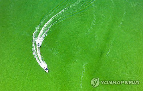 (칠곡=연합뉴스) 윤관식 기자 = 폭염이 계속된 11일 경북 칠곡군 지천지에 녹조가 발생하며 물색이 초록빛으로 변한 가운데 피서객들이 수상 레포츠를 즐기고 있다. 2025.7.11