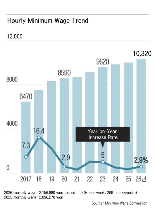 The modest hike contrasts sharply with the more aggressive increases seen in previous administrations’ first years. Under President Roh Moo-hyun, the minimum wage rose by 10.3%; Moon Jae-in’s administration approved a 16.4% increase; and Yoon Suk-yeol’s first-year raise was 5%.