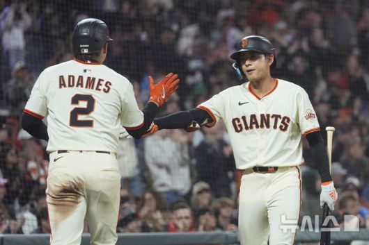 [샌프란시스코=AP/뉴시스] 샌프란시스코 자이언츠의 이정후(오른쪽)가 7일(현지 시간) 미 캘리포니아주 샌프란시스코 오라클 파크에서 열린 2025 메이저리그 필라델피아 필리스와의 경기 8회 말 타석에 들어서면서 득점한 윌리 아다메스를 환영하고 있다. 이정후는 4타수 1안타 1타점 1삼진을 기록했고 샌프란시스코는 3-1로 승리했다. 2025.07.08. |