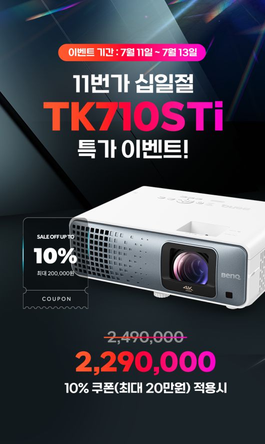[디지털포스트(PC사랑)=임병선 기자] 글로벌 디스플레이 전문 브랜드 벤큐(지사장: 소윤석)는 11번가에서 진행되는 월간 십일절 프로모션(7월 11일~13일)을 맞아 자사의 인기 프로젝터 5종을 대상으로 10% 할인 쿠폰 이벤트를 실시한다고 밝혔다.