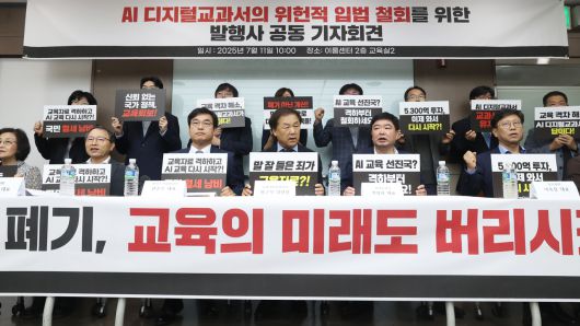 또 "AI 교과서는 미래 공교육을 뒷받침하는 국가 핵심 인프라"라며 "AI 교과서의 교육자료 격하는 미래 교육 시스템 전체를 무력화시키고 교육정책을 후퇴시키는 결정"이라고 말했습니다.