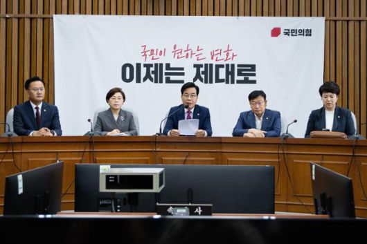 송언석(가운데) 국민의힘 비상대책위원장 겸 원내대표가 11일 국회에서 열린 원내대책회의에서 모두 발언을 하고 있다. 국민의힘은 한국갤럽 기준 2020년 11월 이후 처음으로 지지율이 20% 아래로 내려갔다. 뉴스1 |