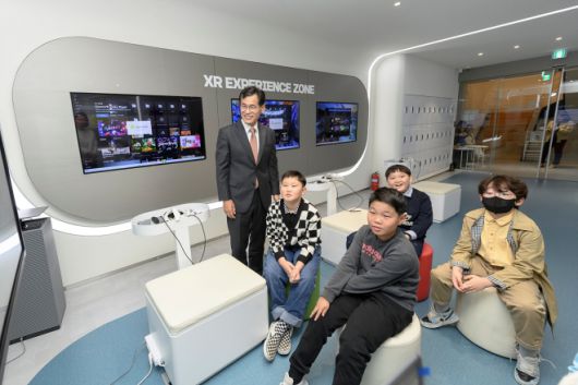 목동미래교육센터 XR(확장현실) 체험존에 참여한 학생들과 이기재 양천구청장. 양천구 제공 |