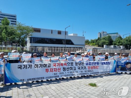 남북경협단체연합회는 11일 오전 대통령실 앞에서 기자회견을 열고 '남북경협기업 피해보상 특별법'을 제정해 "기업파산, 가족해체, 신용불량 등 지난 17년간 희망 고문당해 온 금강산 기업인과 남북경협기업인에게 실질적인 보상을 해달라"고 촉구했다. 2025.7.11/뉴스1 ⓒ News1 김예슬 기자 |