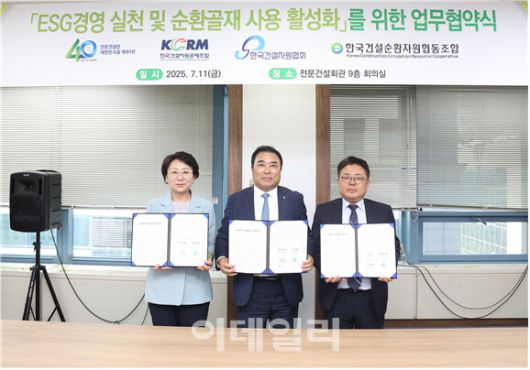 [이데일리 최영지 기자] 대한전문건설협회 중앙회는 11일 서울 전문건설회관에서 한국건설자원공제조합·한국건설순환자원협동조합과 한국건설자원협회와 ‘ESG경영 실천 및 순환골재 사용 활성화’를 위한 다자간 업무협약을 체결했다고 밝혔다.