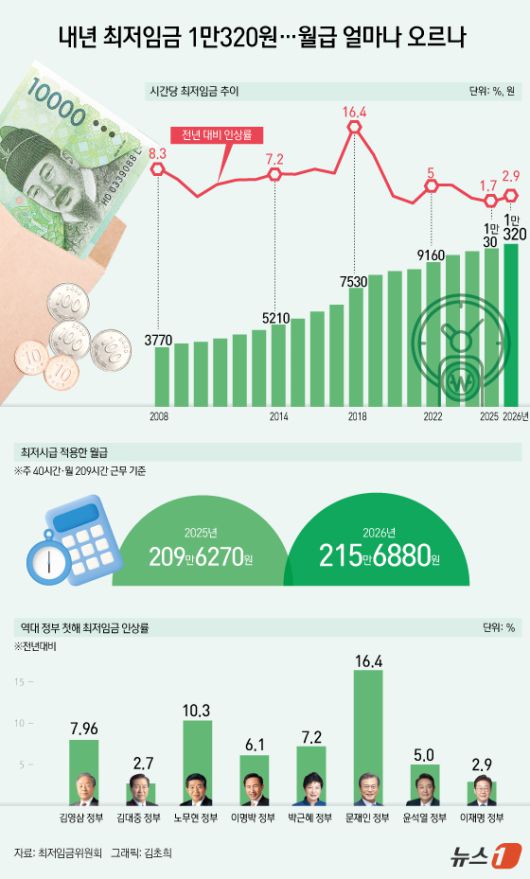 (서울=뉴스1) 김초희 디자이너 = 10일 오후 11시 18분, 최저임금위원회(최임위)는 이날 오후 3시부터 8시간 넘게 이어진 장시간 회의 끝에 내년도 최저임금을 1만 320원으로 결정했다. 월급(주 40시간·월 209시간 근무)으로 환산하면 215만 6880원으로, 올해(209만 6270원)보다 월 6만 610원을 더 받게 된다. 역대 정부 첫 해 인상률과 비교할 때 이재명 정부의 인상률은 낮은 수치다. △김영삼 정부 7.96% △김대중 정부 2.7% △노무현 정부 10.3% △이명박 정부 6.1% △박근혜 정부 7.2% △문재인 정부 16.4% △윤석열 정부 5.0% 등과 비교하면, 김대중 정부 시절 국제통화기금(IMF) 외환위기 상황을 제외하곤 가장 낮다.