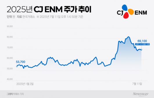 11일 오후 1시 34분 기준 CJ ENM은 전 거래일 대비 0.86% 내린 6만9200원에 거래됐다. 지난달 11일부터 이날까지 10.7% 감소했다. 이 기간 코스피가 11.36% 상승한 점을 고려하면 시장 수익률을 역행한 셈이다. 지난 2023년 11만원선을 기록한 이후 후하향을 그리며 6만~7만원선 사이에서 장기간 횡보하는 흐름을 그려왔다. 이재명 정부 출범 후 문화 산업 기대감이 확대되며 지난달 말 8만원선까지 뛰어 올랐지만 금새 하락세가 나타났다.