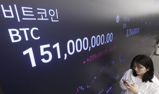 10일 서울 강남구 업비트 고객센터 전광판에 가상화폐 비트코인 시세가 나오고 있다. 뉴시스 |