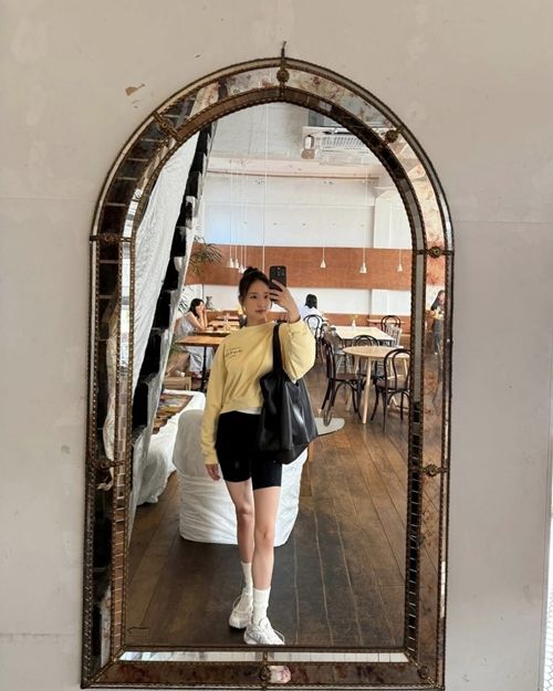 또 다른 컷에서는 고풍스러운 거울 속에 선 채 거침없는 셀카를 남겼다. 옷맵시보다 시선이 닿는 곳이 더 단단해 보였고, 거울 너머의 공간까지 품고 있었다. 운동화 끈처럼 단단하게 묶인 자세, 의자 위 꽈배기처럼 말린 다리, 그 안에 깃든 건 힘이 아니라 습관처럼 남은 유연함이었다.