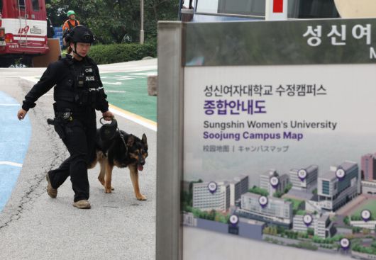 지난 7일 서울 성북구 성신여대에 폭발물이 설치됐다는 의심 신고가 접수돼 경찰특공대 폭발물 처리반이 수색하고 있다. 연합뉴스 |