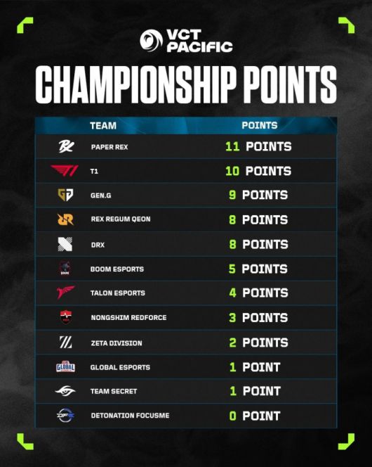 VCT 퍼시픽 스테이지 2에서 우승과 준우승을 차지한 팀은 챔피언스로 직행하고 챔피언십 포인트 상위 두 팀 또한 챔피언스에 출전할 수 있다. 킥오프와 스테이지 1, 두 번의 마스터스를 소화한 결과 페이퍼 렉스가 11포인트로 선두를 달리고 있고 T1이 10포인트, 젠지가 9포인트, DRX가 8포인트, 농심 레드포스가 3포인트를 획득했다. 한국팀 대부분 상위권에 자리하고 있기에 지금까지 보여줬던 페이스를 유지하면 챔피언스에 세 팀이 나갈 수도 있다.