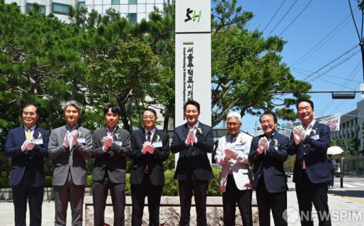 [서울=뉴스핌] 양윤모 기자 = 11일 오후 서울시 강남구 SH 본사 정문 앞에서 개최된 '서울주택도시개발공사' 사명 변경 출범 기념 제막식에 참석한 오세훈 서울시장과 황상하 서울주택도시개발공사(SH) 사장 등이 제막 행사에서 박수를 치고 있다. 2025.07.11 yym58@newspim.com