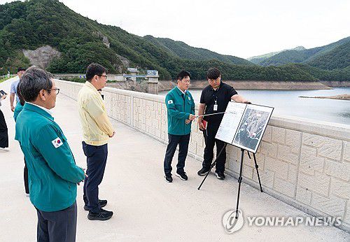 (강릉=연합뉴스) 11일 김홍규 강릉시장과 조현수 원주지방환경청장이 가뭄 현장인 오봉저수지와 홍제정수장을 방문, 가뭄 극복 대책 등을 논의하고 있다. 2025.7.11 [강릉시 제공. 재판매 및 DB 금지]