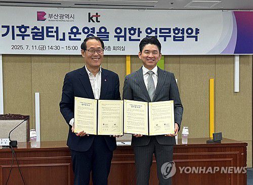 (부산=연합뉴스) KT 부산경남광역본부와 부산시는 11일 부산시청 회의실에서 '우리동네 기후쉼터 운영을 위한 업무협약'을 체결했다. 협약으로 14일부터 부산 시민 누구나 KT 매장에서 폭염을 피해 쉴 수 있다. 2025.7.11 [KT 부산경남광역본부 제공. 재판매 및 DB 금지]