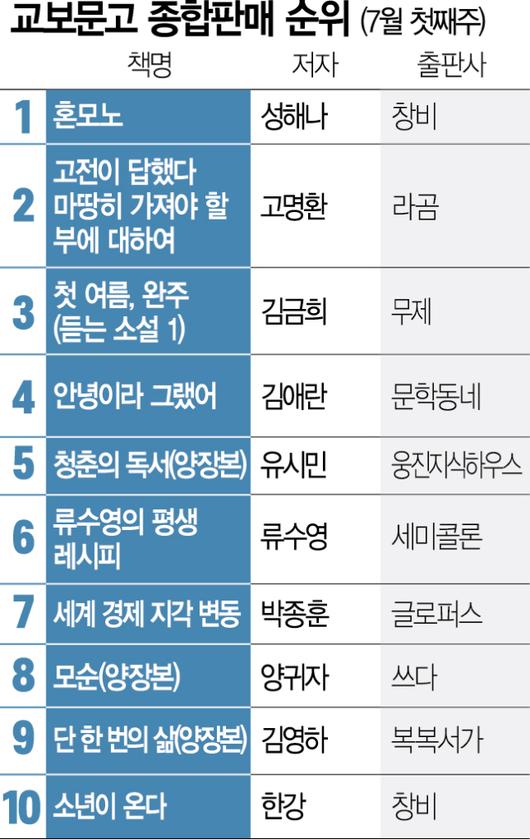 성해나의 ‘혼모노’가 3주 연속 베스트셀러 1위 자리를 지켰다. 김금희의 ‘첫 여름, 완주’와 김애란의 ‘안녕이라 그랬어’는 각각 2계단씩 상승해 종합 3위와 4위에 올랐다. 양귀자의 ‘모순’, 정대건의 ‘급류’도 20대 독자층의 관심을 받으며 상위권을 유지 중이다. 최진영의 ‘구의 증명’은 리커버 에디션 출간을 계기로 14계단 상승한 종합 38위를 기록하며 다시 주목받는 등 한국 문학의 인기가 지속되고 있다.