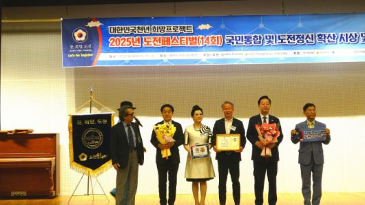 ‘2025 서울 도전페스티벌’이 지난 8일 서울 여의도 국회도서관 대강당에서 개최됐다. ‘모범 특별상’ 부문에서는 SBS ‘생활의 달인’ 수석 PD를 지낸 이상호 예능인방송인선교회 회장(오른쪽 세번째)이 수상했다. / 사진=도전한국인본부 |