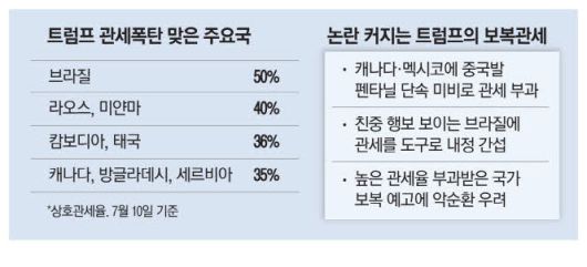 트럼프 대통령은 지난 7일 한국과 일본 등 14개국에 대한 국가별 상호관세율 25∼40%를 적시한 서한을 공개했다. 9일에도 브라질·필리핀 등 8개국에 추가 관세 서한을 보냈다.