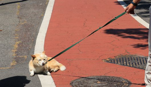 폭염이 계속된 11일 서울 시내에서 강아지가 걷기를 거부하는 듯 바닥에 주저앉아 있다. [사진 출처 = 연합뉴스] |