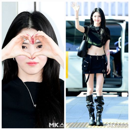 한소희는 이날 블랙 크롭티에 미니 스커트, 그리고 무릎 위까지 올라오는 두꺼운 부츠로 시선을 사로잡았다.
