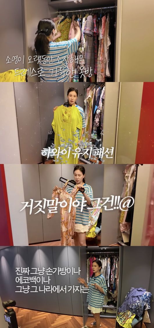 고소영은 “휴양지룩, 약간 선 드레스 같은 거 혹시 유튜브 찍게 될까봐 예쁜 선드레스 몇 개 가져가려고 한다”라며 완전 그런 시상식 드레스 이런 게 아니고 그냥 편하게 입는 거다. 오랫동안 모아온 드레스다”라며 다양한 스타일의 드레스를 소개했다.