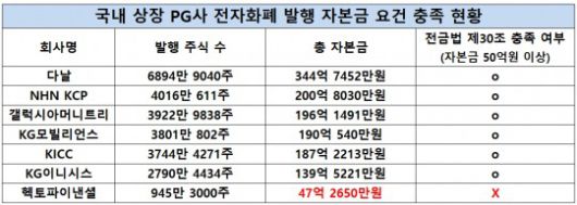 ▲NHN KCP(200억원) ▲갤럭시아머니트리(196억원) ▲KG모빌리언스(190억원) ▲KICC(187억원) ▲KG이니시스(139억원) 모두 총 자본금 50억원을 상회해 전자화폐 즉 스테이블코인 발행 요건을 충족한다.