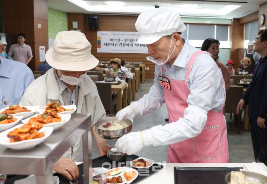[이데일리 김태형 기자] 조성명 강남구청장이 11일 강남시니어플라자에서 오르신 400명을 대상으로 삼계탕 배식 봉사활동을 하고 있다.
