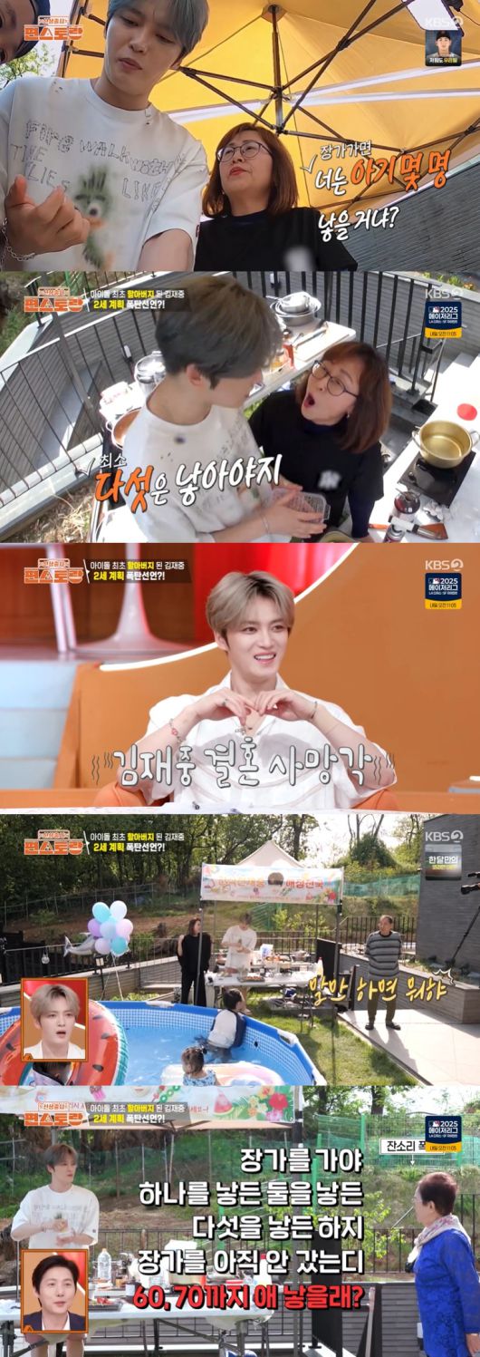 이런 삼촌의 말에 조카는 "할아버지, 삼촌이 아이 다섯 명 낳는대요"라고 전했고, 김재중의 아버지는 1986년생인 아들에 "지금 나이가 몇 살인데 다섯을 낳냐. 살 여자가 있어야지"라고 일침을 가했다.