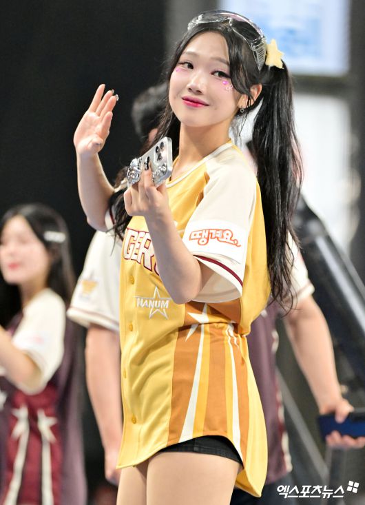 (엑스포츠뉴스 대전, 김한준 기자) 11일 오후 대전한화생명볼파크에서 열린 '2025 신한 SOL Bank KBO 올스타전 홈런레이스, 지아영 치어리더가 열띤 응원을 선보이고 있다.김한준 기자 kowel@xportsnews.com