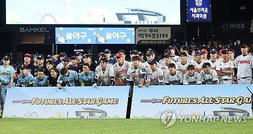 (대전=연합뉴스) 강수환 기자 = 11일 오후 대전 한화생명볼파크에서 열린 '2025 KBO 퓨처스 올스타전' 경기가 4:2 북부 올스타 승리로 끝난 뒤 선수들이 기념사진을 촬영하고 있다. 2025.7.11