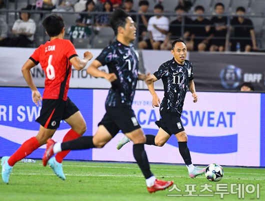 [용인(경기)=스포츠투데이 팽현준 기자] 11일 용인미르스타디움에서 열린 2025 EAFF E-1 챔피언십(동아시안컵) 대한민국과 홍콩의 경기, 후반 한국 문선민이 공격하고 있다. 2025.07.11. [스포츠투데이 팽현준 기자 sports@stoo.com]