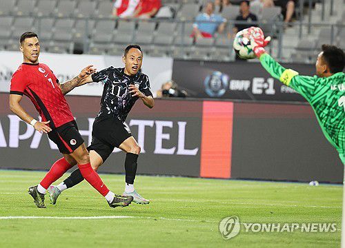 (용인=연합뉴스) 홍기원 기자 = 11일 경기도 용인미르스타디움에서 열린 2025년 동아시아축구연맹(EAFF) E-1 챔피언십(동아시안컵) 남자부 2차전 한국과 홍콩의 경기. 한국 문선민의 슛을 홍콩 골키퍼가 막고 있다. 2025.7.11