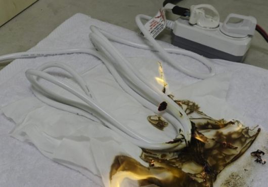 같은 멀티탭에 소비전력 2800W 에어컨 2대를 연결했더니 21분 뒤 멀티탭 전선 온도가 100도를 넘어섰다. 이어 멀티탭 전선을 모아놓고 그 아래에는 천 조각을 두고 같은 조건에서 다시 실험하니 불과 12분 만에 스파크가 튀어 천 조각에 불이 붙었다.