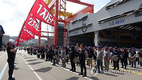 (울산=연합뉴스) HD현대중공업 노조가 올해 임금협상 난항으로 11일 울산 본사에서 파업하는 모습. 2025.7.11 [HD현대중공업 노조 제공. 재판매 및 DB 금지]