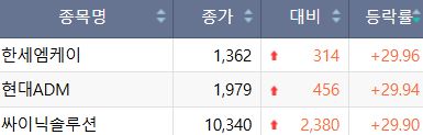 11일 코스피에서 상한가와 하한가를 기록한 종목은 없었다. 코스닥 시장에서는 삼륭물산과 이녹스가 상한가를 기록했다. 상장폐지가 결정돼 지난 3일부터 이날까지 정리매매 기간이었던 CNH는 -43.75%를 기록했다. CNH는 오는 14일 상장폐지된다.