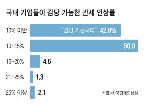 한국경제인협회(한경협)는 “10대 수출 업종 매출 1000대 기업 중 150곳을 조사한 결과, 대상 기업 92%가 ‘미국의 관세율이 15%를 웃돌면 감내하기 어렵다’고 답했다”고 11일 밝혔다. 이번 조사는 지난달 10~17일 이뤄졌다.