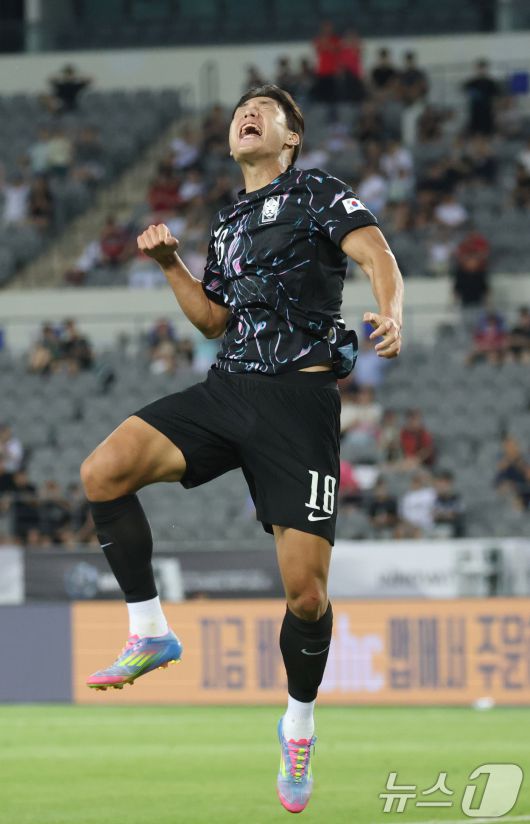 이호재가 11일 오후 경기 용인시 처인구 용인미르스타디움에서 열린 2025 동아시아축구연맹(EAFF) E-1 챔피언십 남자부 대한민국과 홍콩의 경기에서 득점한 뒤 기뻐하고 있다. 2025.7.11/뉴스1 ⓒ News1 김영운 기자 |