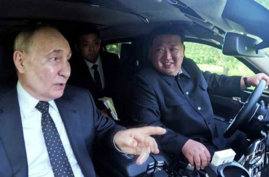 북한 노동당 기관지 노동신문은 2024년 6월 20일 김정은 노동당 총비서가 블라디미르 푸틴 러시아 대통령과 금수산영빈관 정원구역에서 시간을 함께 보내면서 친교를 두터이 했다고 전했다. (평양 노동신문=뉴스1) |