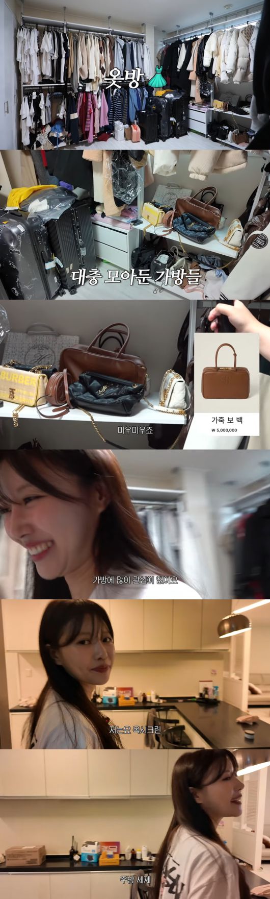이어 드레스룸도 소개했다. 색깔별로 정리된 옷들과 깔끔한 구조가 눈에 띄었고, 한쪽에는 가방을 모아둔 공간도 있었다. 그 중에는 미우미우, 버버리 등 명품 브랜드 가방도 있었지만, 다소 구겨진 채로 놓여 있었다.