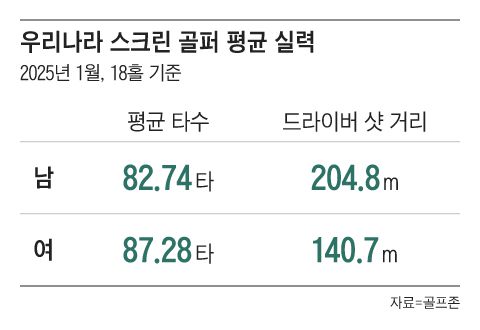우리나라 스크린 골퍼들의 골프 실력은 어떨까? 골프존이 올 상반기 중 가장 많은 스크린 골프 라운드가 진행됐던 1월의 835만 라운드 데이터를 분석한 결과 남성 골퍼의 평균 타수는 82.74타(18홀 기준), 여성 골퍼는 평균 87.28타였다. 다만, 플레이 난이도 설정 기능이 있기 때문에 실제 필드 타수보다 점수가 좋게 나올 수 있다. 남성 골퍼들이 티샷에서 시원하게 드라이버로 때린 공은 평균 204.8m 날아갔다. 여성 골퍼들의 드라이버 샷 거리는 평균 140.7m였다.