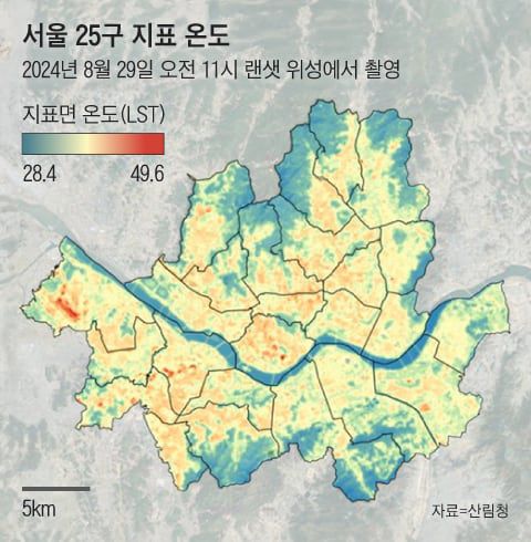 이번 결과는 작년 8월 29일 지표면의 온도를 측정할 수 있는 랜드샛(Landsat) 위성 사진을 AI(인공지능)로 분석한 것이다. 산림청 관계자는 “숲이 우거진 동네가 여름에 더 시원하다는 인식은 있었지만 구체적으로 상관관계를 증명한 건 이번이 처음”이라고 했다.