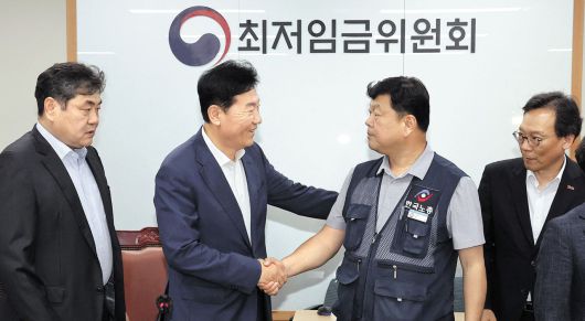 내년도 최저임금이 전년 대비 2.9% 오른 1만320원(시간당)으로 결정됐다. 사진은 지난 10일 늦은 밤 최저임금위원회를 마친 뒤 류기정 사용자위원(경총 전무)과 류기섭 근로자위원(한노총 사무총장)이 악수하는 모습. 왼쪽부터 이인재 최저임금위원장, 류기정·류기섭 위원, 이명로 중기중앙회 인력정책본부장. /연합뉴스 |