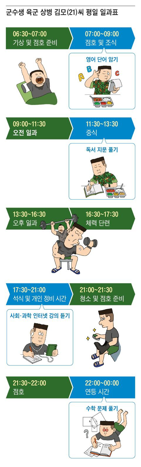 올해 초 육군 비전투 부대에 입대한 일병 이모(19)씨는 한국항공대에 합격했지만 등록하지 않고 군 생활을 하고 있다. 그는 입대 전 1대1로 공부 계획을 짜주고, 진도를 체크해주는 컨설팅 업체에 의뢰해 군수 계획을 짰다. 그는 “부대별로 다른 일과 패턴에 맞춰 공부 계획을 짜준다”며 “훈련이 적은 부대로 갈수록 공부 시간이 늘어나니 이득”이라고 했다. ‘개인 정비’ 시간인 오후 8시쯤 이씨가 본인이 하루 동안 공부한 내용을 카카오톡 메신저로 업체에 보내면, 이 업체가 오후 10시부터 자정까지인 ‘연등(延燈·소등 시간 이후 특별 허가를 받아 점등) 시간’에 추가로 공부해야 할 내용을 정리해서 보내준다고 한다. 이들 업체는 홈페이지에 ‘고딩 때도 못 간 서울 지역 대학 입학을 군대에서 할 수 있다’고 광고하면서 상담 신청을 받고 있다.