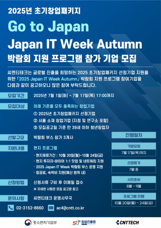 투자 전문 액셀러레이터 씨엔티테크가 중소벤처기업부와 창업진흥원이 주관하는 '2025년 초기창업패키지' 창업지원사업의 일환으로, '2025 Japan IT Week 추계 박람회 지원 프로그램'을 운영한다.