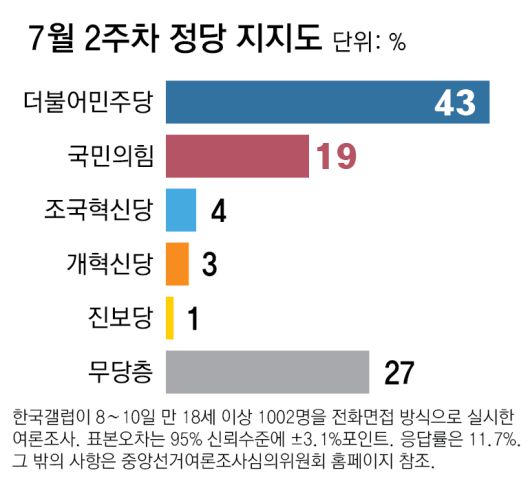 한국갤럽이 8∼10일 실시한 여론조사(무선전화 면접 100% 방식으로 실시·자세한 사항은 중앙선거여론조사심의위원회 홈페이지 참조)에 따르면 민주당 지지도는 43%, 국민의힘 지지도는 19%로 나타났다. 민주당과 국민의힘 간 격차는 24%포인트였다. 한국갤럽은 “국민의힘 지지도가 20%를 밑돈 것은 2020년 11월 이후 처음이다”라고 설명했다. 중도층에서는 민주당 45%, 국민의힘 11%로 조사됐다.