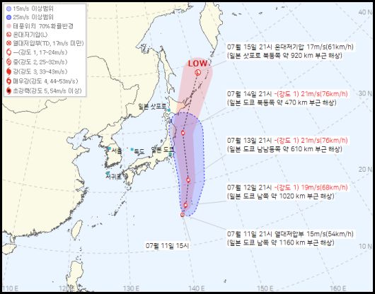 15일(화)에는 세력이 약화해 온대저기압으로 변질되며 더 이상 태풍이 아니게 될 것으로 전망됩니다.
