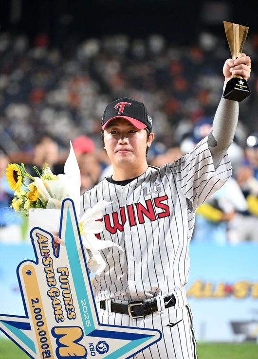 [OSEN=대전, 이대선 기자] SSG, 한화 팬들은 행복했다. 구단의 미래 최윤석(SSG), 한지윤(한화)의 활약을 등에 업은 북부리그 올스타가 퓨처스리그 올스타전 승자로 우뚝 섰다.이대진 감독이 이끄는 북부리그 올스타(한화 이글스, SSG 랜더스, LG 트윈스, 두산 베어스, 고양 히어로즈)는 11일 대전 한화생명볼파크에서 개최된 2025 KBO 퓨처스 올스타전에서 박치왕 감독이 지휘하는 남부리그 올스타(상무, KT 위즈, 삼성 라이온즈, NC 다이노스, 롯데 자이언츠, KIA 타이거즈)를 4-2로 제압했다.북부리그 올스타는 지난해 5-9 패배를 설욕하고 2023년 이후 2년 만에 올스타전 승리를 맛봤다.퓨처스 올스타 MVP를 차지한 손용준이 기념 촬영을 하고 있다. 2025.07.11 / |