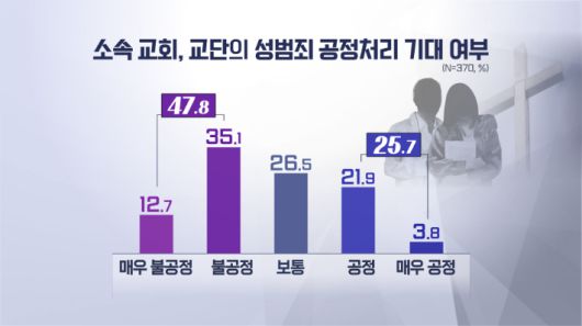 실제로 응답자의 절반 가량인 47.8%는 소속 교회나 교단에서 성희롱을 비롯한 성범죄 처리가 공정하지 않을 것으로 판단했습니다. 공정할 거라는 기대는 25.7%에 그쳤습니다.
