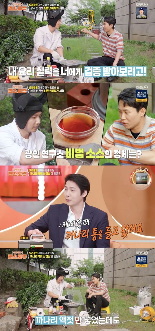 첫 번째 비법 소스는 까나리 액젓이었다. 이상우는 “친동생이 해병대 시절 백령도에서 파견 나갔다가 에서 삼겹살에 까나리 액젓을 발라서 먹더라. 20년 전에 동생이 삼겹살에 까나리 발라서 먹는데 맛있다고 했다. 제대할 때 까나리 통을 들고 제대했다. 그때는 별 관심이 없었는데 20년 만에 떠올라서 발라서 해보자 했다”라고 전했다.